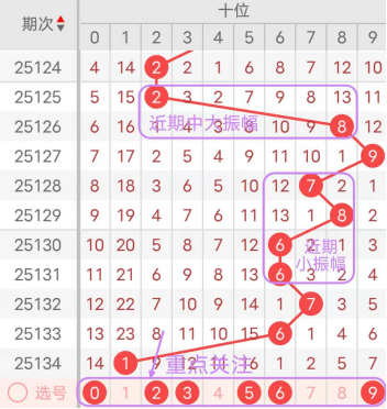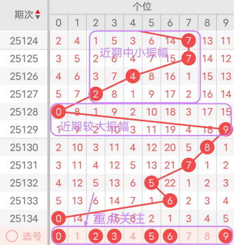 近7期(128~134)开奖号个位号码球分别为0、9、8、7、5、6、0,开奖号与上一期走出的振幅分别为2、9、1、1、2、1、6。128期走出0号小数号码球,走出“2”的小幅度,129期走出9号大数号码球,走出“9”的大幅度,130期走出8号大数号码球,走出“1”的小幅度,131期走出7号大数号码球,走出“1”的小幅度,132期走出5号中大数号码球,走出“2”的小幅度,133期走出6号中大数号码球,走出“1”的中小幅度,上期走出0号小数号码球,走出“6”的中大幅度;从近期振幅大小的走势及大小走势来看,中大振幅走在5~9之间较为适宜,中小振幅走在0~3之间较为适宜;结合走势图的整体及大小走势分析,本期个位应重点关注号码球为0、2、3、5、6、9。