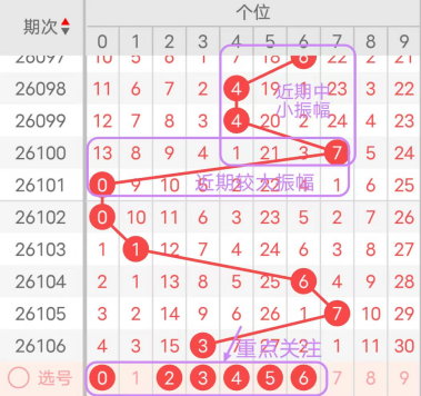 7期(100~106)开奖号个位号码球分别为7、0、0、1、6、7、3,开奖号与上一期走出的振幅分别为3、7、0、1、5、1、4。100期走出7号大数号码球,走出“3”的中小幅度,101期走出0号小数号码球,走出“7”的大幅度,102期走出0号小数号码球,走出“0”的小幅度,103期走出1号小数号码球,走出“1”的小幅度,104期走出6号中大数号码球,走出“5”的中大幅度,105期走出7号大数号码球,走出“1”的小幅度,106期走出3号中小数号码球,走出“4”的中小幅度;从近期振幅大小的走势及大小走势来看,中大振幅走在3~4之间较为适宜,中小振幅走在0~2之间较为适宜;结合走势图的整体及大小走势分析,本期个位应重点关注号码球为0、2、3、4、5、6