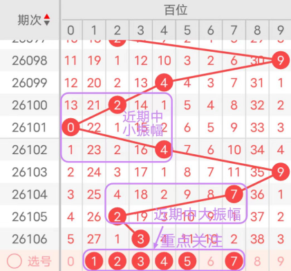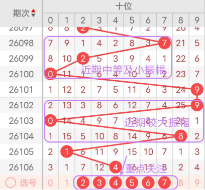 7期(100~106)开奖号十位号码球分别为0、9、9、0、8、1、4,开奖号与上一期走出的振幅分别为2、9、0、9、8、7、3。100期走出0号小数号码球,走出“2”的小幅度,101期走出9号大数号码球,走出“9”的小幅度,102期走出9号大数号码球,走出“0”的小幅度,103期走出9号大数号码球,走出“9”的大幅度,104期走出8号大数号码球,走出“8”的大幅度,105期走出1号小数号码球,走出“7”的大幅度,106期走出4号中小数号码球,走出“3”的中小幅度;从振幅大小及走势图的整体对应来看,中大振幅走在3~4之间较为适宜,中小振幅走在0~2之间较为适宜;结合走势图的上下对应及振幅大小分析,本期十位应重点关注号码球为2、3、4、5、6、7。