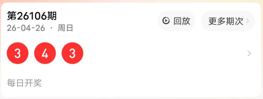 2026106期开奖号码为343,奇偶值为12奇;大小值为3小;012路走势为001路;跨度为1跨;和值10点;组三形态。