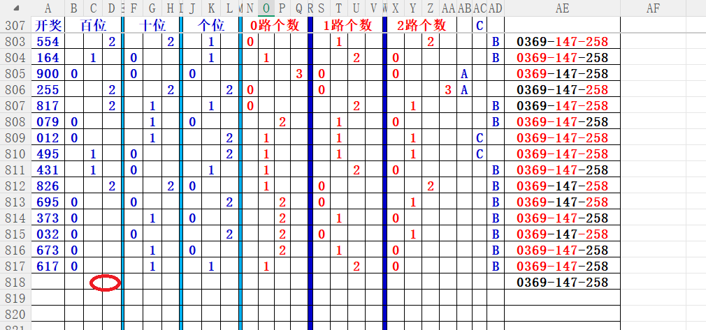 如上图56,012路分析0路出号的概率还是很大,本期可以从0路号入手做胆0369中选;看好369胆码。
