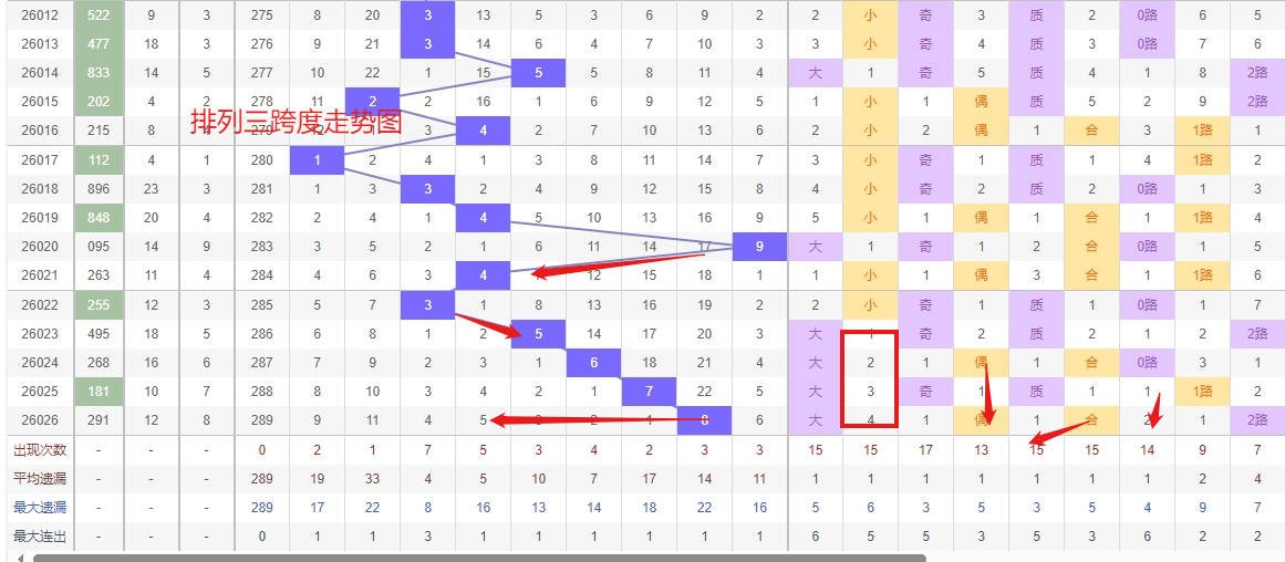 排列三 跨度分析:从上图可以看出近100期的跨度大小比约为47比53,跨度奇偶比约为49比51总体来看还是比较均衡的,但跨度大小之间有点差异。我们再从历史开出8跨后下一期6跨度数据来做参考。最近10期跨度大小比约为5:5期开出小数跨度过多返回大数跨度的概率更高一点。历史开奖近2期出8跨以后的走势为306期开出8跨后下一期走5跨走出3振幅,第317期开出8跨后下一期走6跨走2振幅第324期开出8跨后下一期开出2跨走出6振幅。连续多期大振幅,近期走势来看,跨度3呈现出明显的热态,连续或频繁开出,这种趋势一旦形成,往往具有一定的惯性,因此“有连下的可能”是符合热号走势逻辑的,短期内仍需将其作为重点关注的跨度选项。与此同时,跨度2处于冷态,已经遗漏了相当长的期数。从概率平衡和冷号回补的规律来看,任何一个跨度都不可能长期遗漏,跨度2的理论回补压力正在逐渐累积,值得开始警惕。出8跨度后容易走出2到6个跨度振幅的对称形态,跨度走出2到6个振幅看好的跨度有2367跨,所以第2026027期排列三跨度推荐2367跨。
