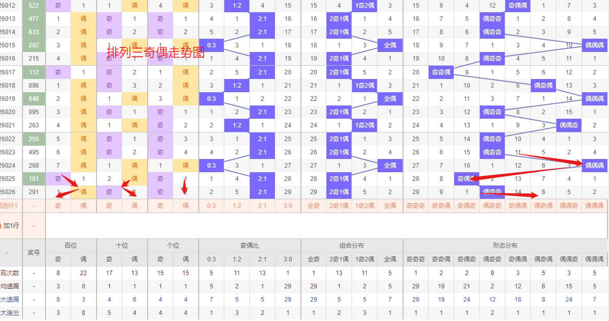 排列三 奇偶分析:从上图可以看出排列三100期内百位奇偶比约为45比55,十位奇偶比为46比54,个位奇偶比为51比49,个位的比值比较均衡,但是十位的比值偏差就有点大,历史奇偶形态近2期开出偶奇奇后下一期的走势为,第303期开出偶奇奇后304期开偶偶奇, 第317期开出偶奇奇后第318期开偶奇偶,第323期开出偶奇奇后第324期开奇奇偶,近期排列三的奇偶走势来看,“偶奇偶”形态呈现出明确的热态,其出号节奏紧凑且具备一定的连续性,这种已形成的趋势惯性使得它在短期内“有连下的可能”,应是当前跟踪的重点方向。与此同时,“偶偶奇”作为温号形态,虽然热度不及前者,但并未长期遗漏,正处于蓄势状态。所以排列三2026027期奇偶形态推偶偶奇与偶奇偶。