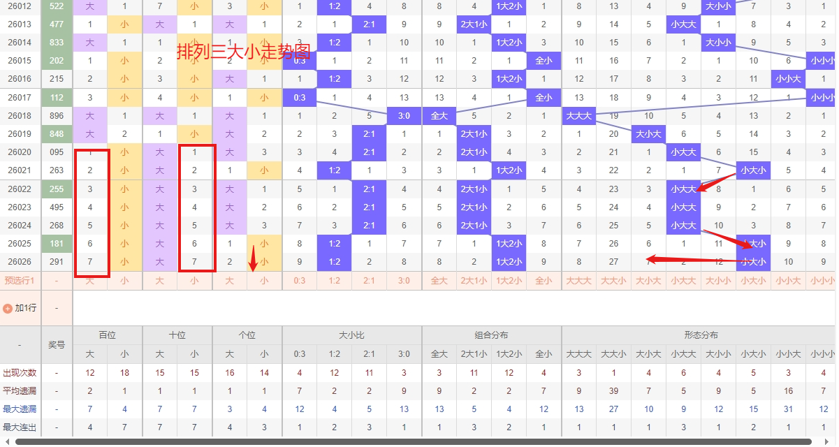 排列三 大小形态分析:从大小走势图上可以看出排列三100期内百位大小比约为47比53,十位大小比约为45:55,个位大小比约为51比49,除了个位奇数比偶数多,十位和百位偶数比奇数多。历史数据近2期开出小大小下一期的走势为,第307期开出小大小第308期开大大小。第317期开出小大小后第318期开小小小,第325期开出小大小后326期开大小小。近期排列三的大小走势分析,“小小小”形态表现活跃,形成了明确的热号态势,这种全小组合的持续走热,反映了号码在小区间内密集出现的趋势惯性,短期内仍需作为防范重点,其热度可能尚未完全释放。与此同时,“大大小”形态则处于明显的冷态,已遗漏较长周期。从概率平衡与冷热转换的常规规律来看,任何极端形态都无法长期缺席,“大大小”作为冷号,其理论回补压力正在逐步累积,存在较强的回补可能。所以排列三第2026027期大小形态推荐大大小防小小小。