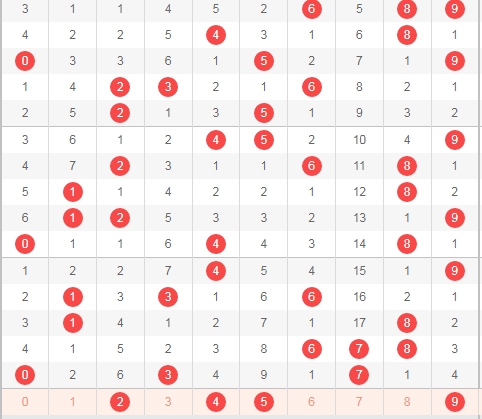 上图是体彩排列三开奖号码走势图,我在上面走势图中标注出来的数字都是遗漏比较大的,个人觉得本期应该至少要出一个吧,也就是数字2459至少出1个吧,因为一般遗漏周期比较大的数字都是值得关注的,其次最近出遗漏周期小的号码也是比较多的,所以数字2459至少出1个吧。
