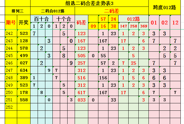 组合看合差,巧用合差选号,可提升中奖可能性。码合差定义即:开奖号中三个数字两两相加的和尾、两两相减的绝对值,及二者变化规律,能让选号更理性、有依据。基于往期开奖数据做走势图表,从多角度展示二码合差数字分布特征,对比号码组合差异,挖掘号码潜在关联,进而筛选高潜力组合。