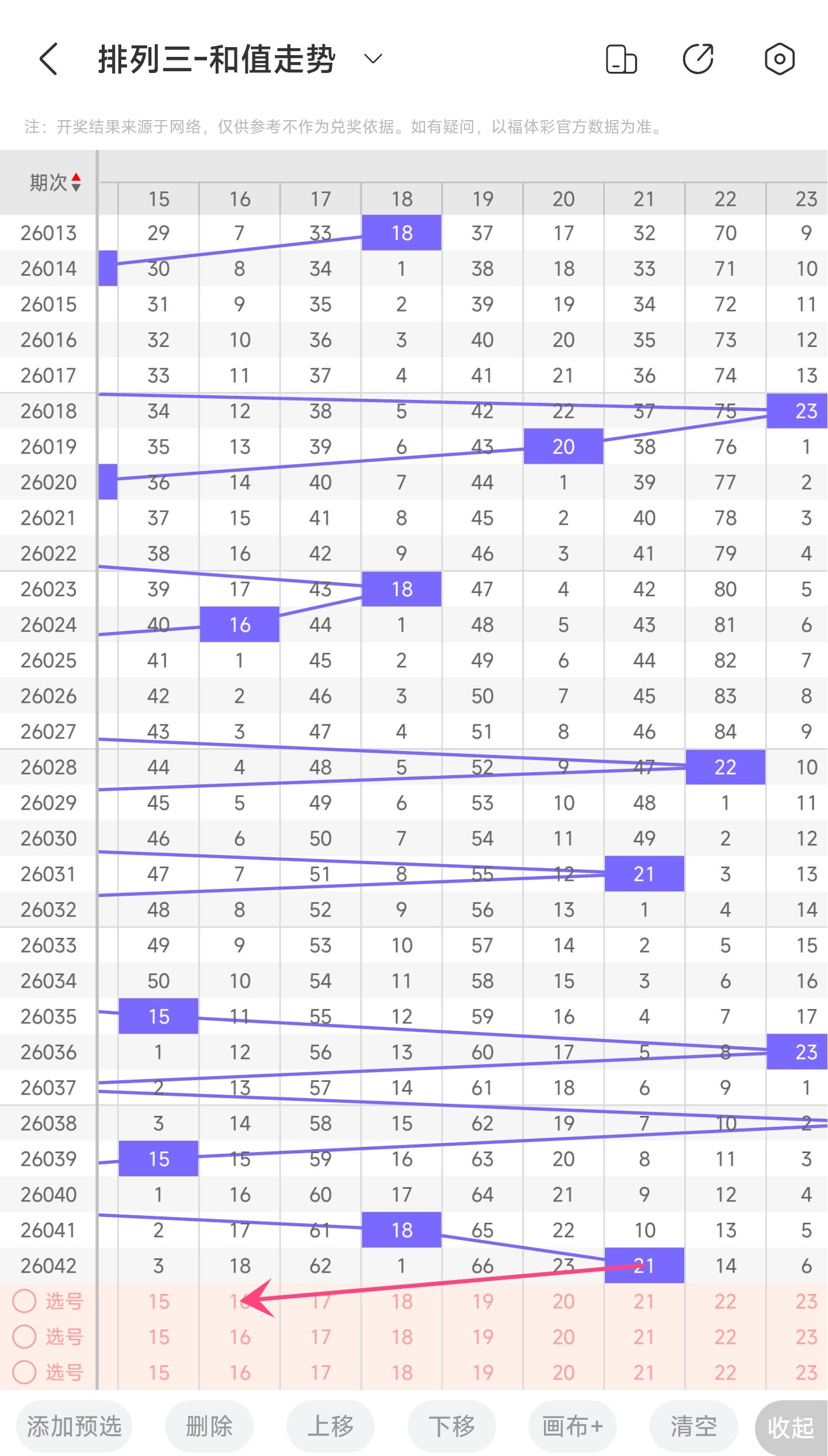 上期和值为21,往前一期和值为18,趋势往右移动,偏移量为3。通过走势图分析,21和值是近30期内开出很大的和值,上升空间比较小,下降空间比较大,本期比较看好和值变小。因此推测本期趋势是往左的,和值会变小,小概率往右,和值变大。