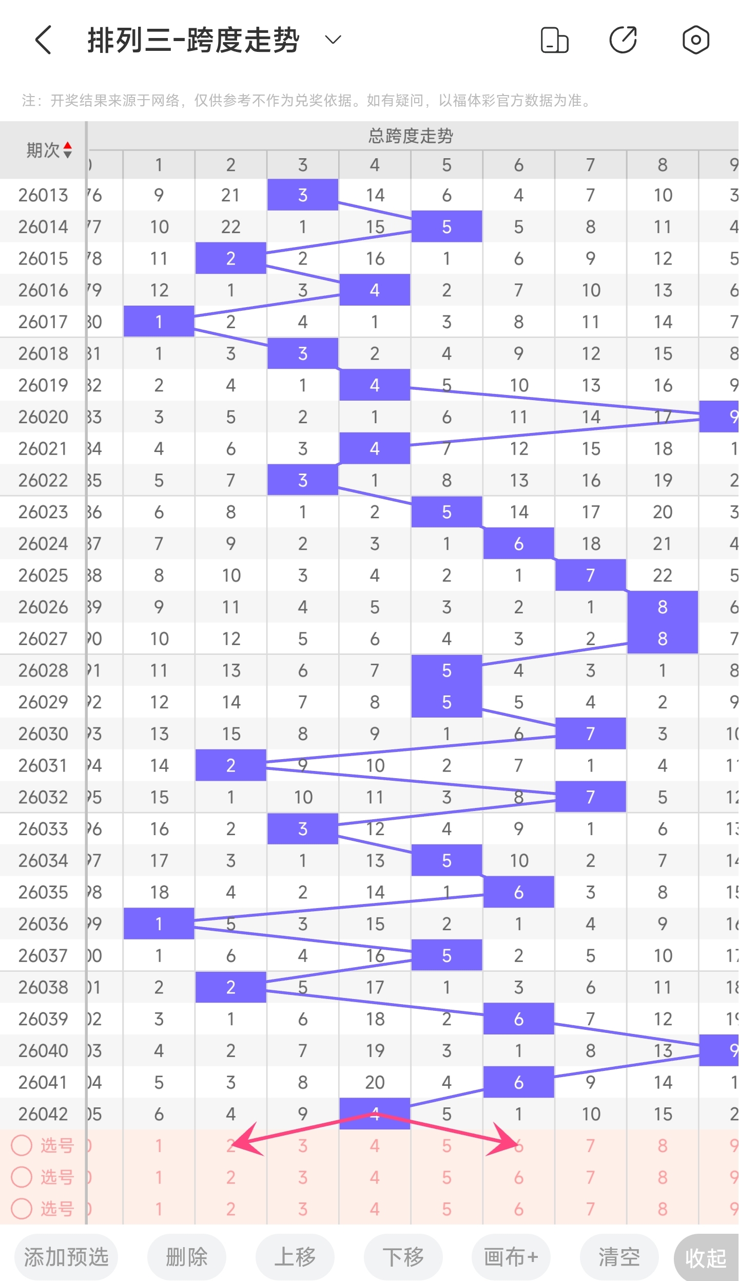 上期跨度为4,往前一期跨度是6,趋势往左移动,偏移量为2。跨度值4时,跨度值是近30期开出中间的值。通过走势图分析,目前的趋势可能往左也可能往右。所以推测本期跨度可能为23678等跨度。