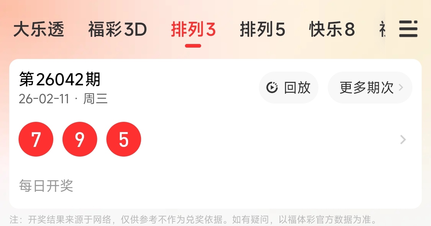 上期排列3开出795,和尾为1,跨度为4,奇偶比为3:0,大小比为3:0012路个数对比为1:1:1