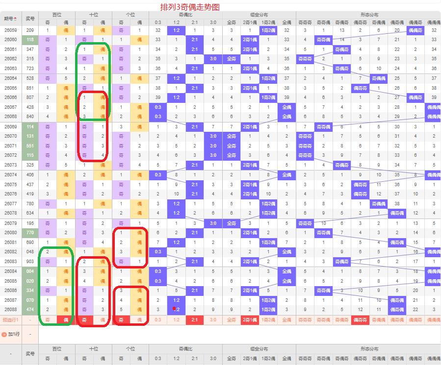 上一期的奇偶比为1:2,两偶的号码组合,从近五期的奇偶数出现情况看,奇数出4次,偶数出现11次,奇数号码出现较少,本期要侧重两奇的号码组合,侧重偶奇奇或偶奇偶的号码组合,根据奇偶组合形态可做五码定位02468/13579/13579或02468/13579/02468