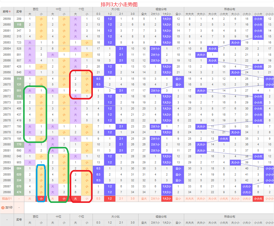 上一期012路个数比为0:3:0,是全1路的号码组合,上期断掉02路的号码,本期的号码以两路的组六组合号码为主,本期0路的号码可能会出现,本期应该会有1路的号码,本期以01的组六组合号码为主,防02路和12路的组合,侧重01路的号码组合