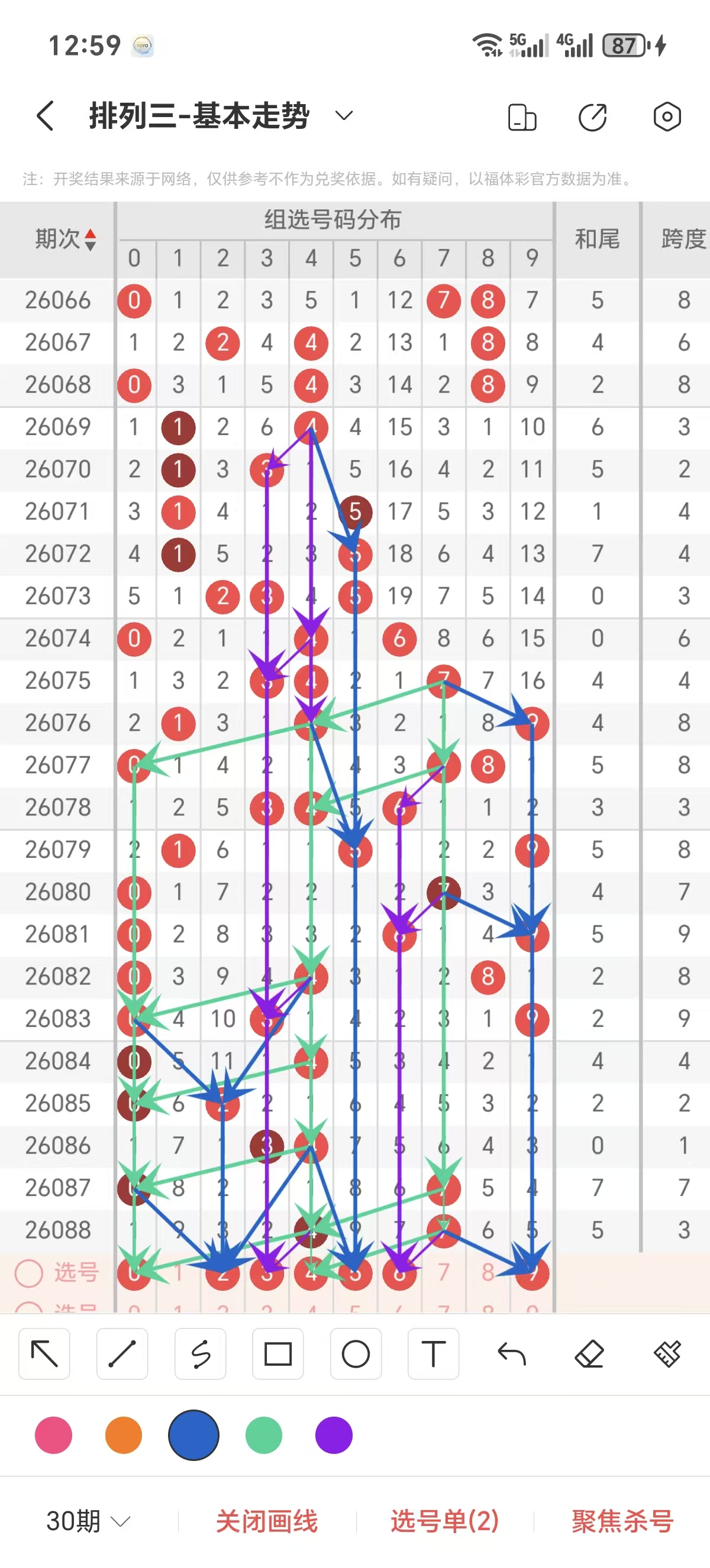 通常情况下在五期之内重复一个跨度的概率较高,近五期没有重复的跨度,近五期跨度为4/2/1/7/3,近期1路的跨度较热,本期要侧重3/4/6跨为主的号码组合。选择好跨度就可以从跨度方面选择相应的双胆码组合,双胆码的选取要根据近期和历史的走势进一步的分析选取。