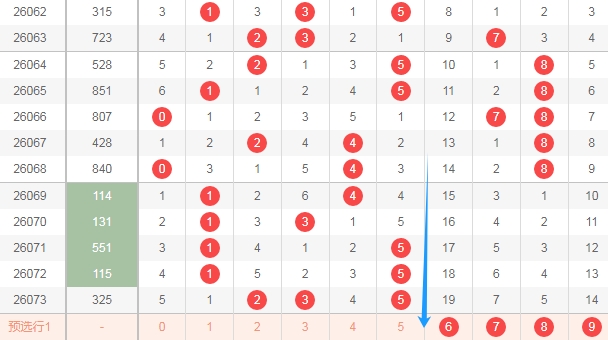 上图是体彩排列三开奖号码走势分布图,我标志出来的数字6789这个区域已经连续5期没出现号码,那么本期这个区域的数字开出的机会是有的,关注这个区域数字出1个或者2个,防出三个。