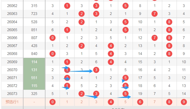 上图是体彩排列三开奖号码走势分布图,我标志出来的数字都是合数数字,标志出来的蓝色小箭头都是质数数字,很明显最近几期开出的质数数字多,那么本期可以关注出合数数字04689出一个或者两个,防出3个吧。