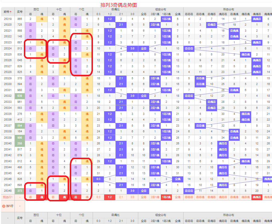 上一期的奇偶比为3:0,全奇的号码组合,从近五期的奇偶数出现情况看,奇数出9次,偶数出现6次,奇数号码出现较多,本期要侧重两偶的号码组合,侧重偶偶奇或偶奇偶的号码组合,根据奇偶组合形态可做五码定位02468/02468/13579或02468/13579/02468