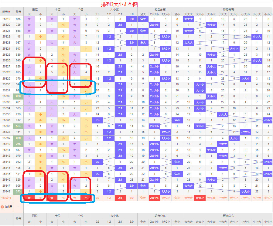 上一期大小比为1:2,两小的号码组合,近五期大号出8次,小号出7次,大小号码出现较平均,上一期是两小的号码组合,本期侧重两大的号码组合,百位侧重大号码,十位侧重大号码,个位侧重小号码,侧重大大小或者小大小的号码组合,根据大小形态五码定位56789/56789/01234或者01234/56789/01234