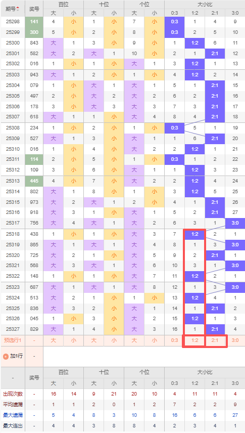 上期大小比:2:1,近10期大小比出现情况:1:2、3:0、2:1、3:0、1:2、3:0、1:2、2:1、1:2、2:1,最近10期出3期2:1,出现4期1:2,出现0期0:3,出现3期3:0,根据近10期出号规律本期推荐连出2:1,防隔期出1:2,综上所述大小比推荐:防:1:2,重点关注:2:1。