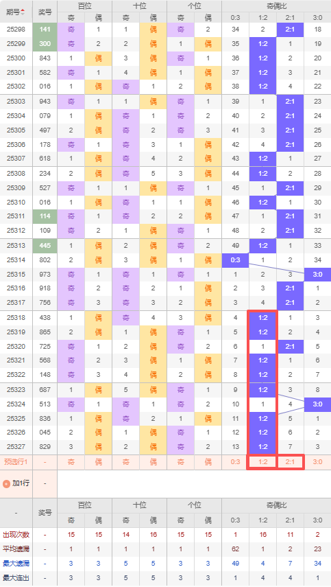 上期奇偶比:1:2,近10期奇偶比出现情况:1:2、1:2、2:1、1:2、1:2、1:2、3:0、1:2、1:2、1:2,最近10期出现1期2:1,出现8期1:2,出现0期0:3,出现1期3:0,根据近10期出号规律本期推荐四连出的1:2,防遗漏7期出2:1,综上所述奇偶比推荐:防:2:1,重点关注:1:2。