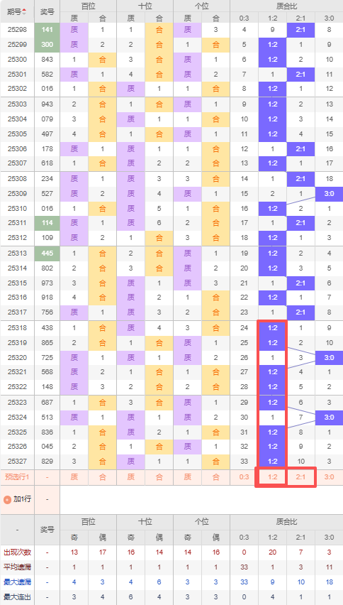 上期质合比:1:2,近10期质合比出现情况:1:2、1:2、3:0、1:2、1:2、1:2、3:0、1:2、1:2、1:2,最近10期出现0期2:1,出现8期1:2,出现0期0:3,出现2期3:0,根据近10期规律本期推荐四连出1:2,防遗漏10期出2:1,综上所述质合比推荐:防:2:1,重点关注:1:2。
