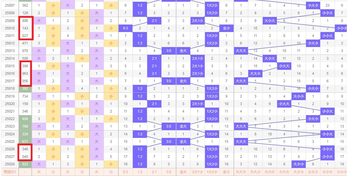 大小走势分析: 在前一期(第028期)的开奖结果中,号码组合为822,呈现出“小小大”的大小形态。回顾历史同期数据,第029期开奖的大小比例显示为大号占据优势,具体比例为32:22。基于这一趋势,本期预判大号将继续保持热度,建议大小比例关注2:1的配置。