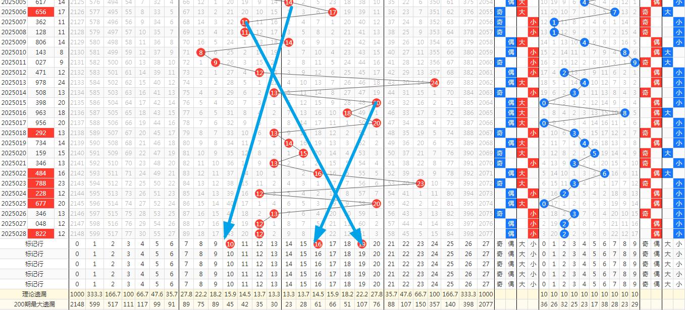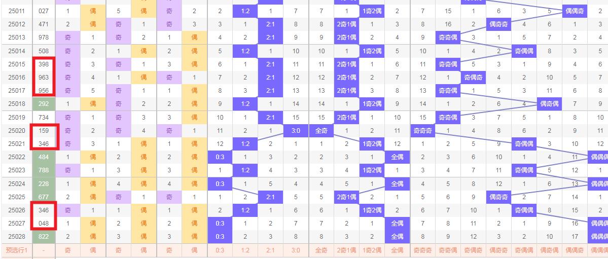 奇偶比例分析 第028期开奖号码的奇偶比为0:3,偶数占据主导地位。然而,在历史同期数据中,奇号的表现相对更为活跃,奇偶比为29:25。鉴于这一历史趋势,本期看好奇号能够重拾升势,奇偶比例建议参考2:1的比例配置。