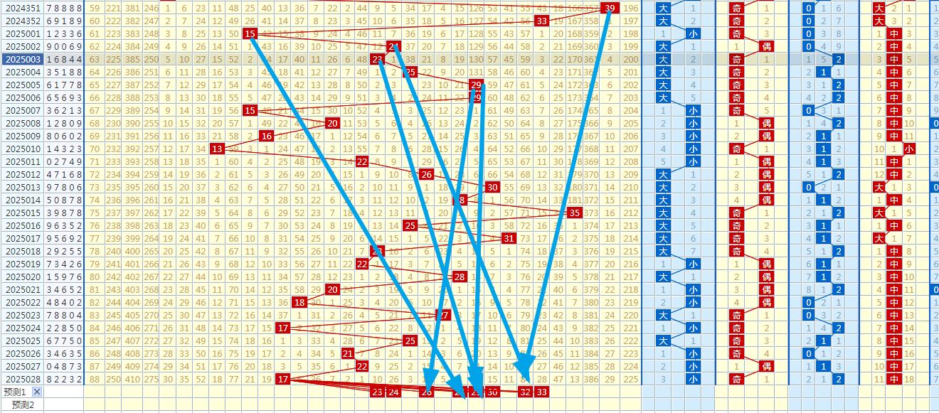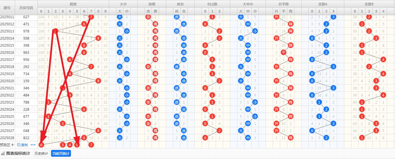 跨度预判分析 第028期开奖号码的跨度值为6。在历史同期数据中,跨度大小的比例为13:8,小数跨度相对较少。此外,012路跨度的分布比例为4:5:12,其中2路跨度最为频繁出现。因此,029期预测跨度将延续历史走势,特别关注0、3、4、5、7等小数跨度的可能性。