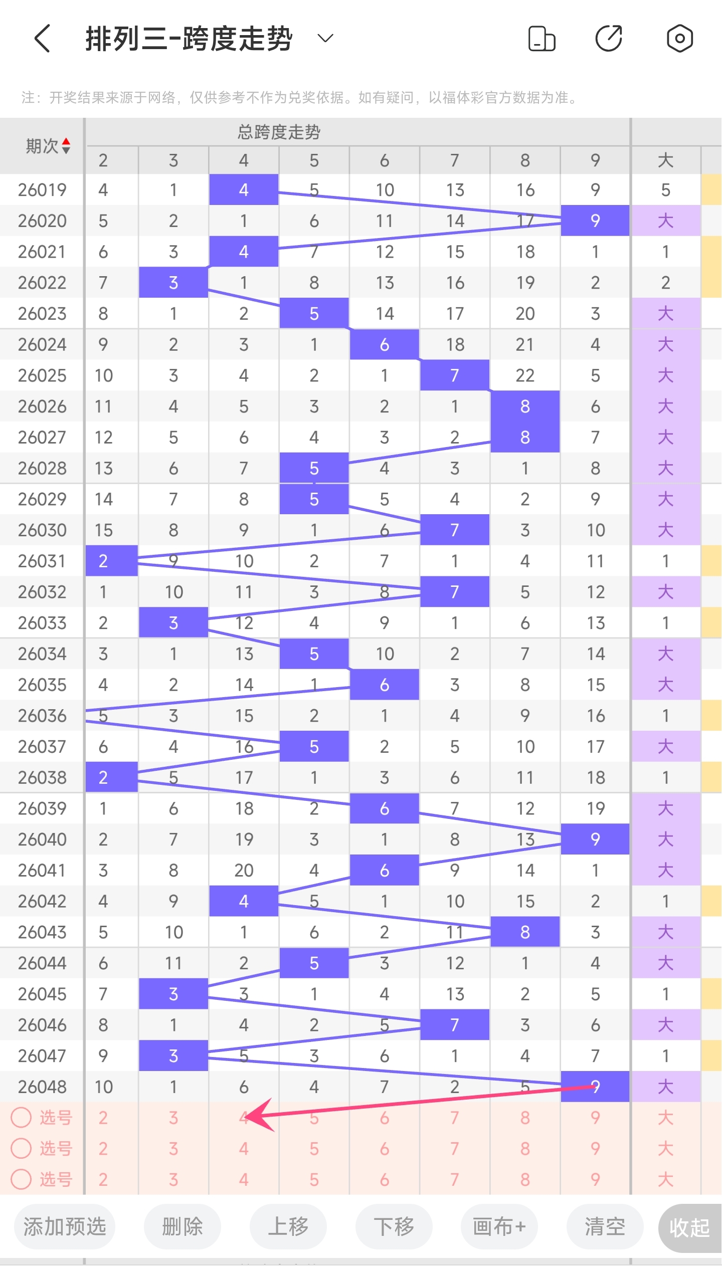 上期跨度为9,往前一期跨度是3,趋势往右移动,偏移量为6。跨度值9时,跨度值是近30期开出最大的值。通过走势图分析,目前的趋势是大概率往左,小概率不动。所以推测本期跨度可能为34578等跨度。