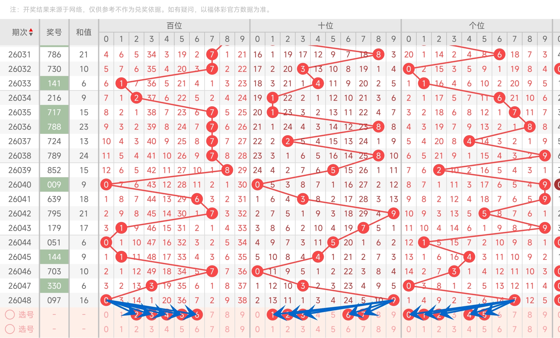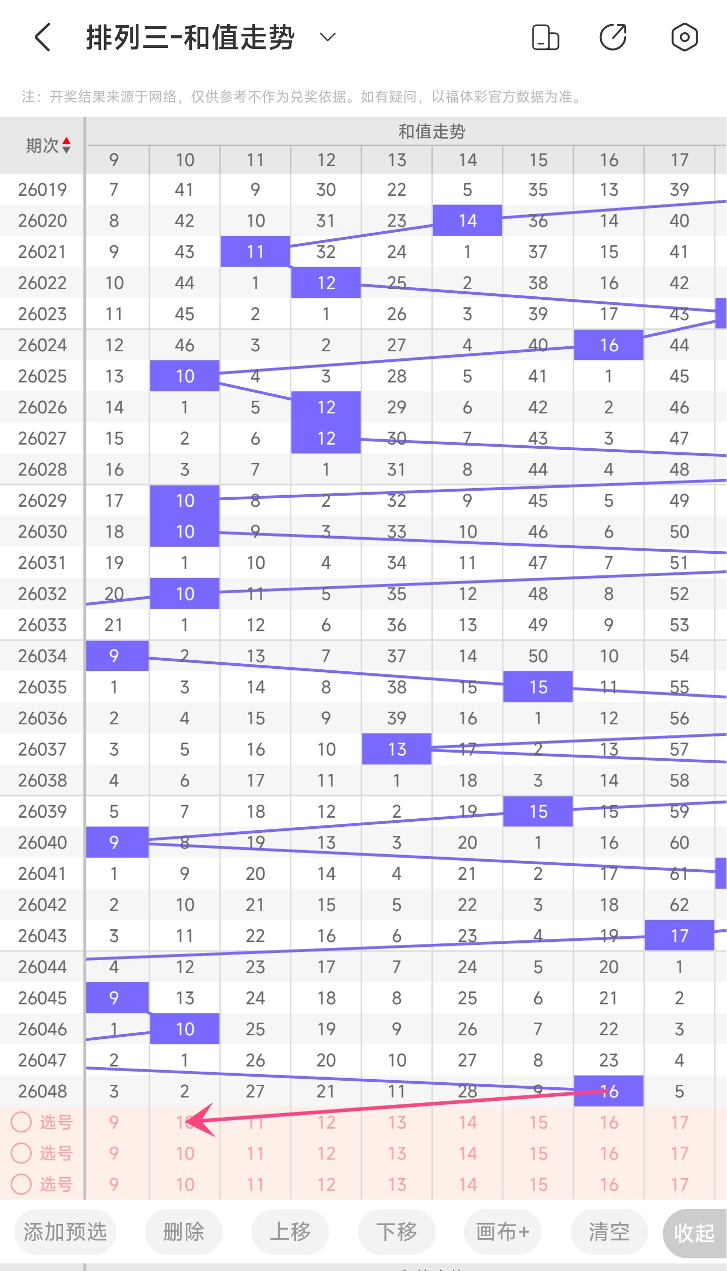 上期和值为16,往前一期和值为6,趋势往右移动,偏移量为10。通过走势图分析,16和值是近30期内开出中间的和值,下降空间和上升空间差不多,本期比较看好和值变小。因此推测本期趋势是往左的,和值会变小,小概率往右,和值变大。
