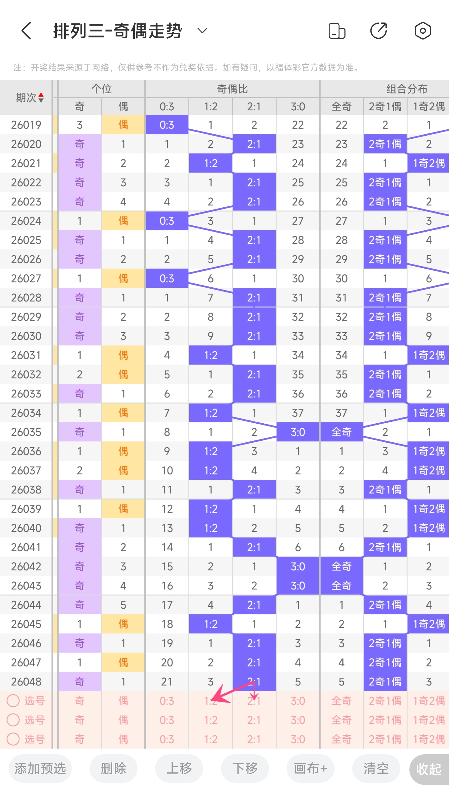 上期开出了2:1的奇偶比。往前一期是2:1奇偶比。通过分析奇偶走势图,近30期内开出1:2奇偶比的次数是8次,开出2:1奇偶比的次数是16次,3:0是3次,0:3是3次。和前一期相比,2:1次数变多,1:2次数变少。通过走势图分析,上期开2:1奇偶比,本期看好1:2奇偶比。所以推测本期可能开1:2奇偶比,其次是2:1奇偶比,最后是3:0或者0:3奇偶比。