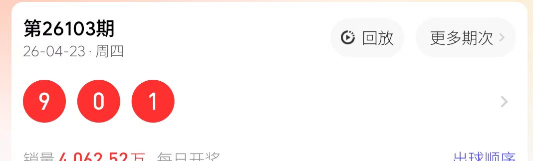 排列3第26104期 开奖结果为 9 0 1