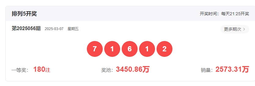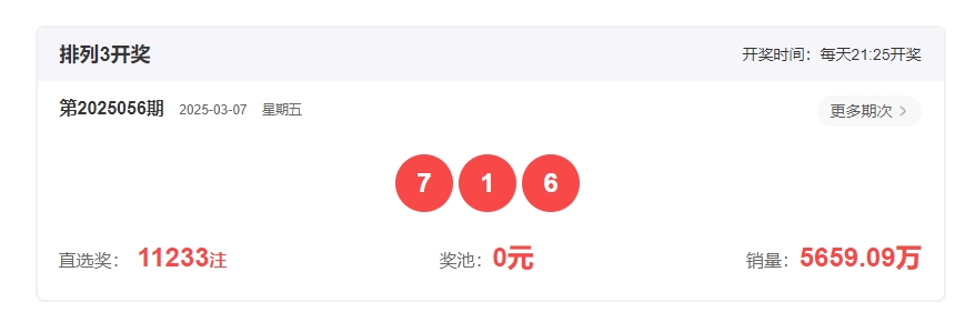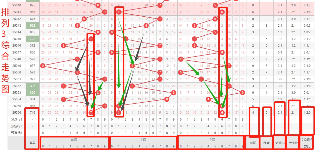体彩排列3第2025056开奖号码为716,形态为组六,奇偶比2:1,和值14,跨度6,大小比2:1,【012】路个数比1:2:0。
