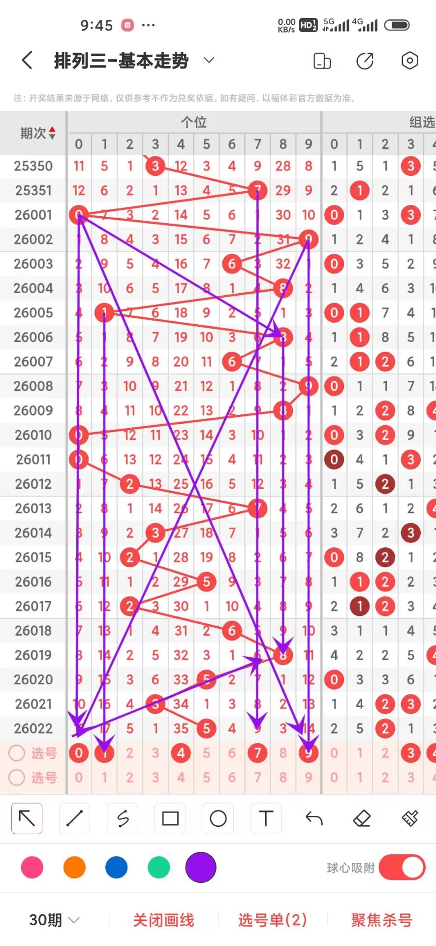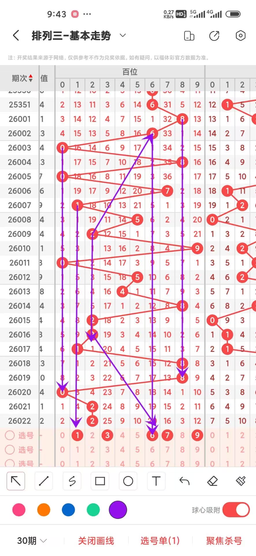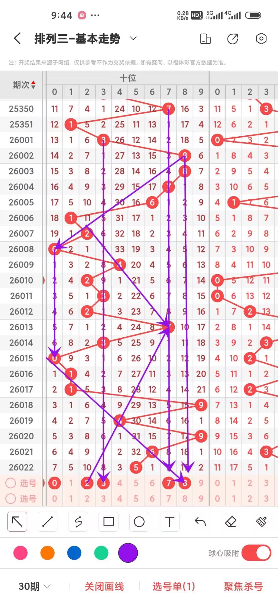 2026023期,上期个位开出奇数5,我们通过走势图来看300期,012路中平均遗漏和最大连出的数据,其中0路平均遗漏总数是42次,0369分别遗漏11,7,12,12次,这几路3遗漏最少,我们在来看0路号码的最大连出2次,0369分别在300期内最高是2连,分别是2,2,2,2,再来看1路号平均遗漏总数26次,147分别遗漏是10,8,8次,在看1路号最大连出是3,147分别是2,3,3,再回过头来看2路号平均遗漏总数是27,258分别遗漏是8,9,10次,2路号最高连出是2,258分别是2,2,2,我们再来看个位中目前冷号阶段的号码是0149,在热号阶段的是奇数,通过上面的分析我们可以做出以下判断,个位今天看01479,防冷号小号回补具体看下面走势图