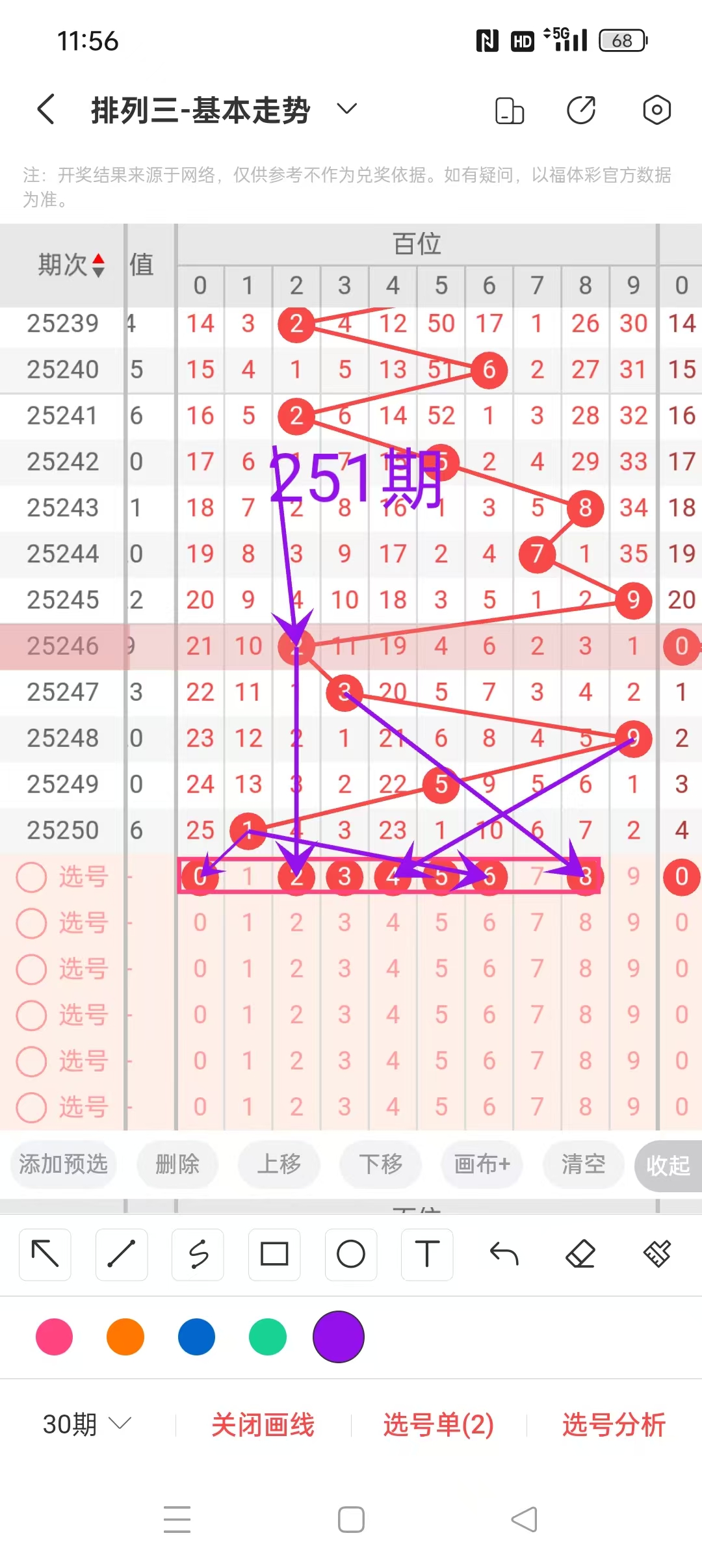 首先运用18年购彩经验和0.618公式快速得出排列三251期,初步经验判断,奖号形态组六,2大1小,我们继续详细分析