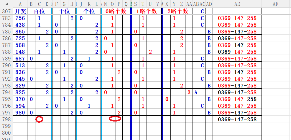 如上图56,012路分析0路出号的概率还是很大,本期可以0路号入手做胆0369中选;看好369胆码