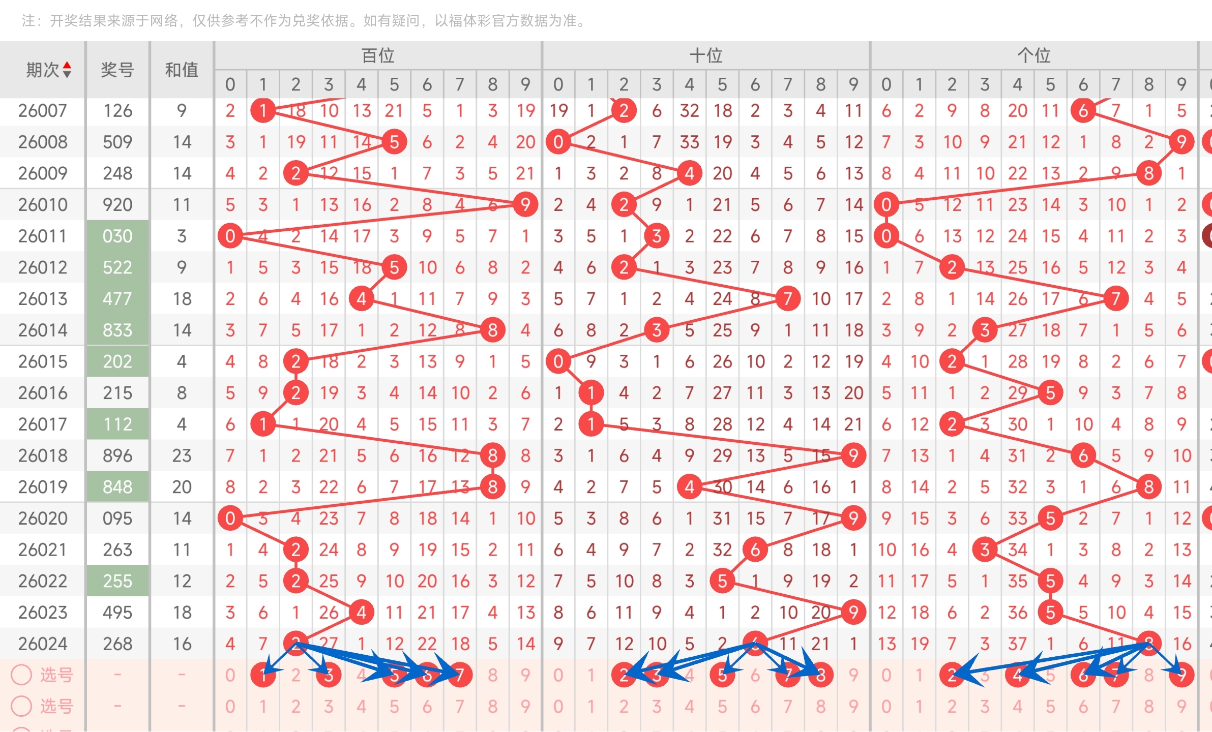 上期排列3开出268,和尾为6,跨度为6,奇偶比为0:3,大小比为2:1,012路个数对比为1:0:2。