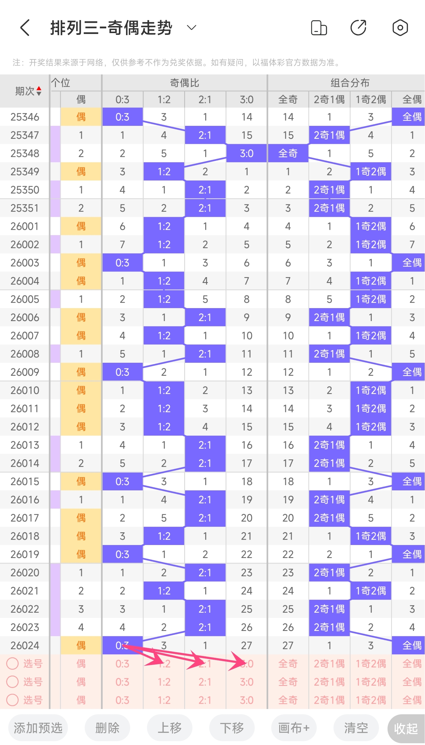 上期开出了0:3的奇偶比。往前一期是2:1奇偶比。通过分析奇偶走势图,近30期内开出1:2奇偶比的次数是11次,开出2:1奇偶比的次数是12次,3:0是1次,0:3是6次。和前一期相比,0:3次数变多,2:1次数变少。通过走势图分析,上期开0:3奇偶比,本期看好1:2奇偶比。所以推测本期可能开1:2奇偶比,其次是2:1奇偶比,最后是3:0或者0:3奇偶比。