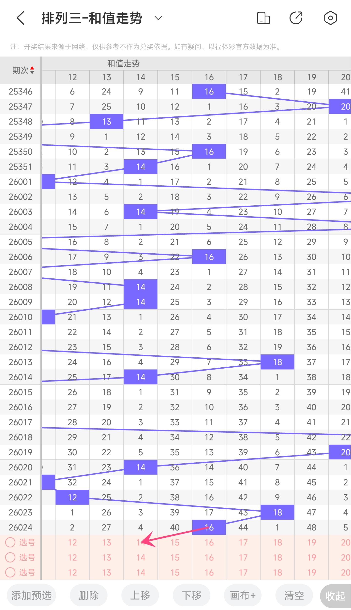 上期和值为16,往前一期和值为18,趋势往左移动,偏移量为2。通过走势图分析,16和值是近30期内开出中间的和值,上升空间和下降空间差不多。本期看好和值变小,因此推测本期趋势是往左的,和值会变小,小概率往右,和值变大。