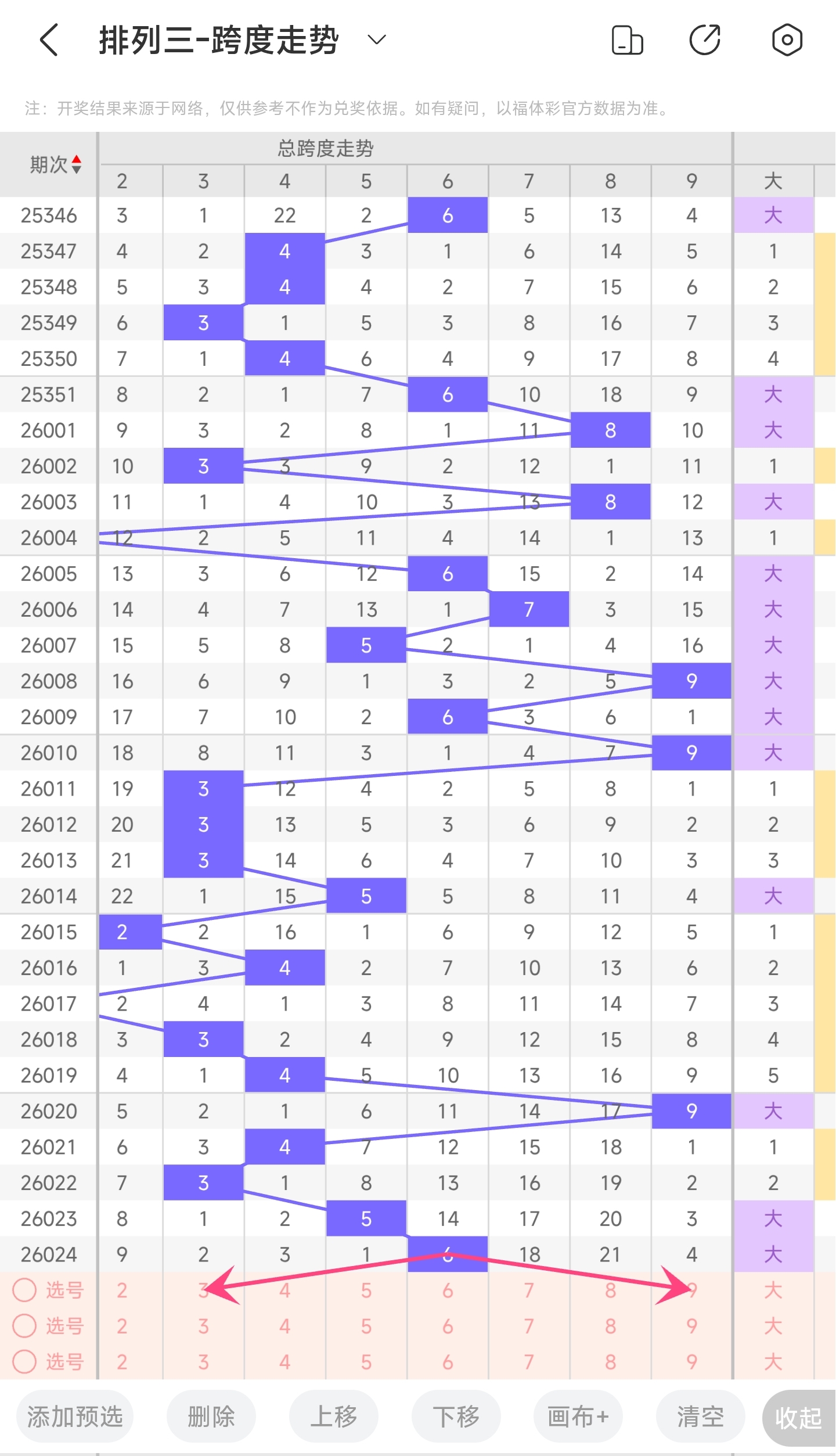 上期跨度为6,往前一期跨度是5,趋势往右移动,偏移量为1。跨度值6时,跨度值是近30期开出中间位置的值。通过走势图分析,目前的趋势是可能往左也可能往右。所以推测本期跨度可能为23478等跨度。