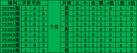 排列三是从0-9每期开出3个号码,截至2025306期三个位置最大遗漏的是34期十位的6号。
