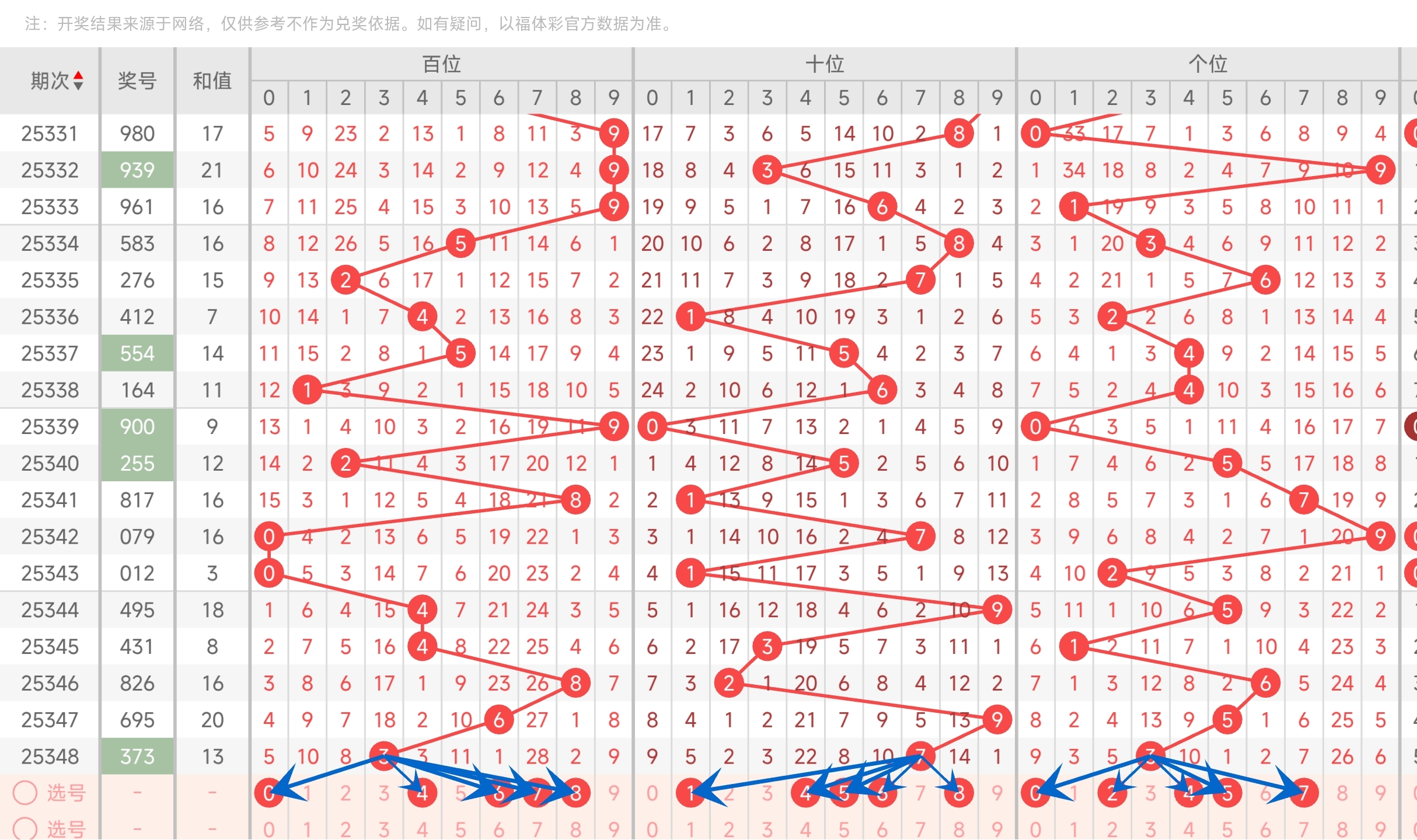 上期和值为13,往前一期和值为20,趋势往左移动,偏移量为7。通过走势图分析,13和值是近30期内开出比较小的和值,下降空间比较小,上升空间比较大。本期看好和值变大,因此推测本期趋势是往右的,和值会变大,小概率往左,和值变小。