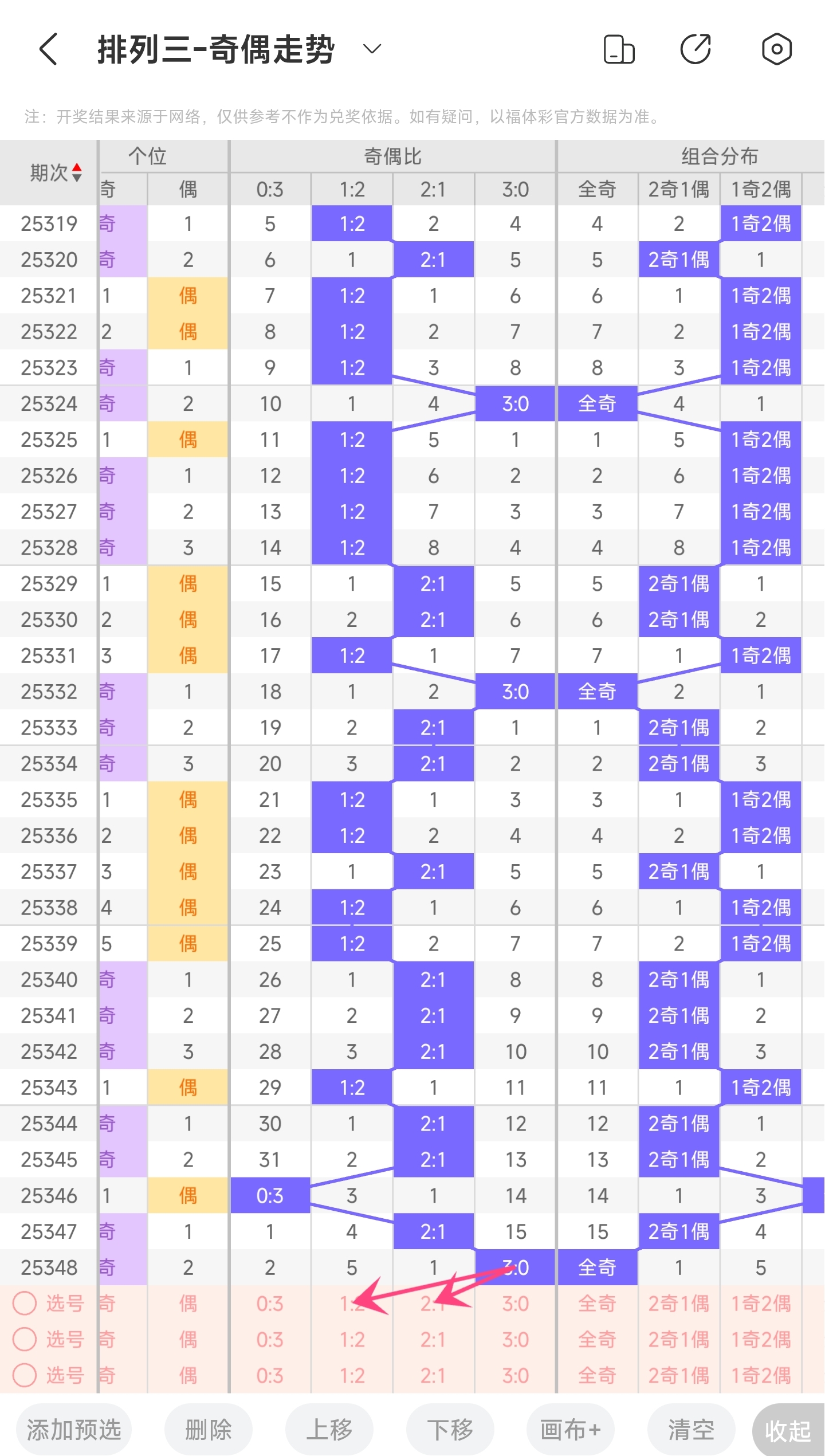 上期开出了3:0的奇偶比。往前一期是2:1奇偶比。通过分析奇偶走势图,近30期内开出1:2奇偶比的次数是14次,开出2:1奇偶比的次数是12次,3:03次,0:31次。和前一期相比,3:0次数变多1:2次数变少。通过走势图分析,可以看到上期开了3:0,一般都不会连出,所以本期看好2:1奇偶比。所以推测本期可能开2:1奇偶比,其次是1:2奇偶比,最后是3:0或者0:3奇偶比。