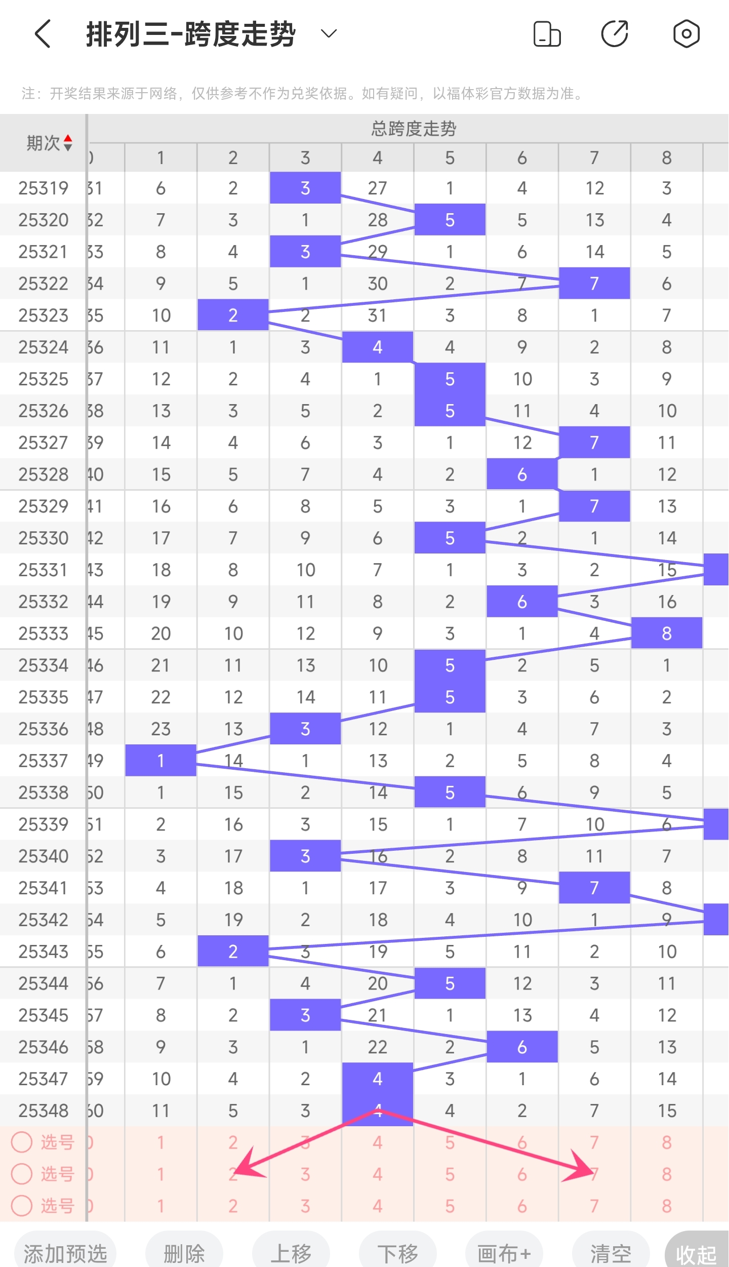 上期跨度为4,往前一期跨度是4,趋势没有移动,偏移量为0。跨度值4时,跨度值是近30期内开出比较中间的值。通过走势图分析,目前的趋势是可能往左也可能往右。所以推测本期跨度可能为23678等跨度。