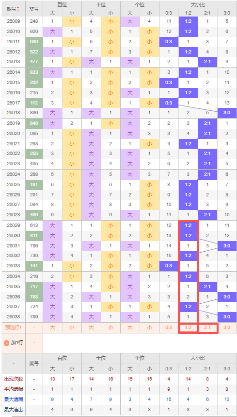 上期大小比:3:0,近10期大小比出现情况:1:2、1:2、3:0、1:2、0:3、1:2、2:1、3:0、1:2、3:0,最近10期出1期2:1,出现5期1:2,出现1期0:3,出现3期3:0,根据近10期出号规律本期推荐隔期出1:2,防遗漏3期出2:1,综上所述大小比推荐:防:2:1,重点关注:1:2。
