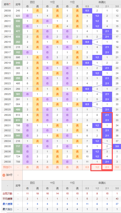 上期奇偶比:2:1,近10期奇偶比出现情况:2:1、2:1、1:2、2:1、2:1、1:2、3:0、1:2、1:2、2:1,最近10期出现5期2:1,出现4期1:2,出现0期0:3,出现1期3:0,根据近10期出号规律本期推荐隔期出1:2,防连出2:1,综上所述奇偶比推荐:防:2:1,重点关注:1:2。