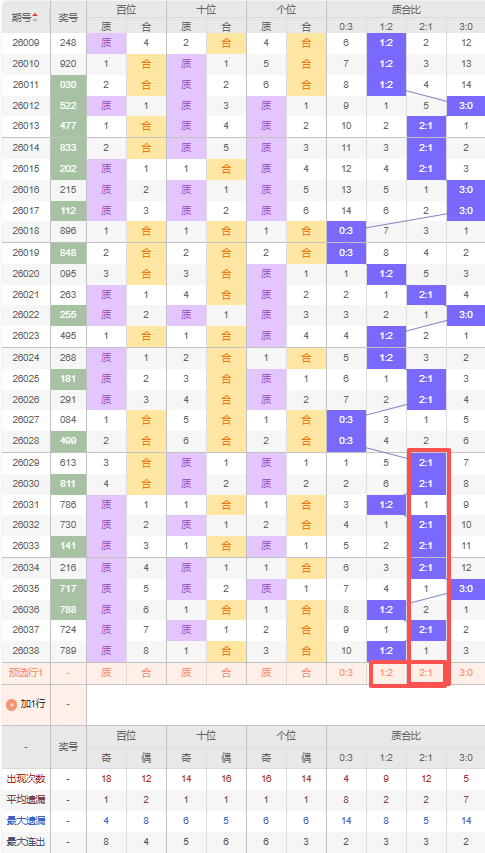上期质合比:1:2,近10期质合比出现情况:2:1、2:1、1:2、2:1、2:1、2:1、3:0、1:2、2:1、1:2,最近10期出现6期2:1,出现3期1:2,出现0期0:3,出现1期3:0,根据近10期规律本期推荐隔期出1:2,防连出2:1,综上所述质合比推荐:防:2:1,重点关注:1:2。
