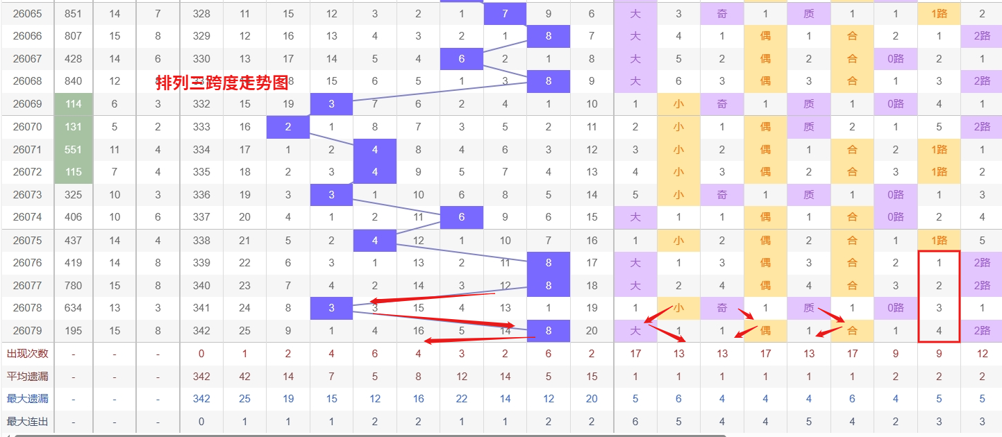 排列三走势分析:从上图可以看出百位号码连线走势到小奇数1,近10期内大数小数之间基本均衡,近期小数空缺较多有走向小数的势头。上期开出奖号1,回补了小奇数1路号码的不足符合我们的预期。前10次百位开出奖号1之后,其下期分别开出码:337588481,其中号码奇偶比约为6:4,大小比约为5:5, 近期排列三百位走势中,数字4表现相当抢眼,已连续多期在百位高频现身,从位置热度的延续性和号码惯性来看,短期内确实存在“连下”或反复落位的可能,尤其是在近期百位整体波动幅度有限、中段号码占据主导的背景下,4作为热号核心具备较强的持续发力基础;而另一方面,数字9则在百位长期隐身,遗漏期数已累积到较高水平,属于典型的冷号类型,本期该位注意号码:03479,排列三十位走势近期小数一直占据上风比较强势且出号热号区一直处于小数,回补了一期小数后有返回大数的可能,第2026079期开出大奇数9, 近期排列三十位走势中,数字1表现相当活跃,已在个位连续多期高频亮相,从位置热度的惯性延续和个位数小号整体回温的趋势来看,1作为当前十位的领头羊,短期内确实存在再次连落的可能,尤其在与和值偏低、跨度偏小的组合共振时,个位小号更容易集中爆发,而1恰好处于这一区间的核心位置;反观数字6,则在十位长期缺阵,遗漏期数已累积到不容忽视的程度,属于典型的冷号类型,虽然在随机游戏中冷号未必立即回补,所以第2026080排列三十位看好13678,个位经过2期的偶数回补后走奇数的可能开出号码5符合我们的预期,本期有走偶数的迹象。连线走势上到大奇5,2路号码奇数,近期排列三个位走势呈现出冷热交织的典型格局,其中数字2与6在个位上已连续多期处于遗漏状态,双双落入冷号区间,这在概率分布上属于明显的偏离现象,因为个位作为出号最活跃的位置之一,小号2和中段号6本应具备稳定的出现频率,当前的长期断档意味着它们已积累了较强的回补动能,一旦个位走势从极端值向中低位回归,2和6极有可能联手发起反弹;然而与此同时,数字9却在个位表现异常强势,近期高频现身并牢牢占据热号榜首,显示出极强的惯性延续特征,所以排列三第2026080期个位推荐24689。