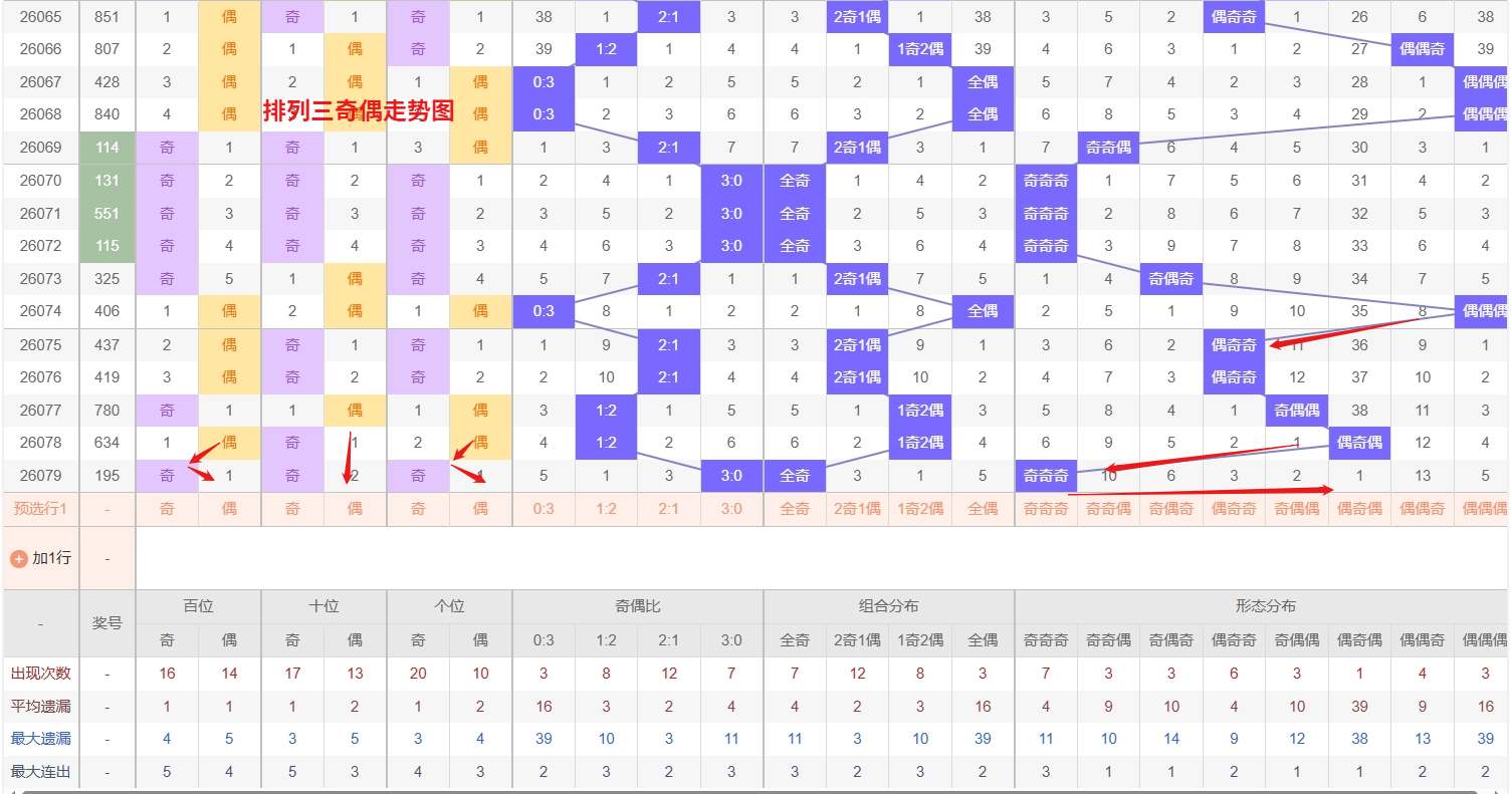排列三 奇偶分析:从上图可以看出排列三100期内百位奇偶比约为48比52,十位奇偶比为53比47,个位奇偶比为55比45,百位的比值比较均衡,但是个位的比值偏差就有点大,历史奇偶形态近2期开出奇奇奇后下一期的走势为,第345期开出奇奇奇后346期开奇偶奇, 第005期开出奇奇奇后第006期开偶偶奇,第024期开出奇奇奇后第025期开偶奇偶, 近期排列三奇偶走势中,奇偶奇组合已运行在温号区间多期,随着出号频次逐步抬升,其形态正显露出由温转热的苗头,尤其在近几期百位与个位奇数回补频率加快、十位偶数虽略显疲态但仍有支撑的背景下,该组合具备较强的惯性延续可能,值得作为近期重点跟进方向;与此同时,偶奇偶组合则陷入明显低谷,属于当前走势中的冷门形态,虽然在连续冷落后未必会立刻爆发,但考虑到奇偶切换往往呈现“冷热交替、极端回补”的特征,一旦偶数在百位与个位形成同步回补、十位奇数完成调整,所以排列三2026080期奇偶形态推奇偶奇与偶奇偶。