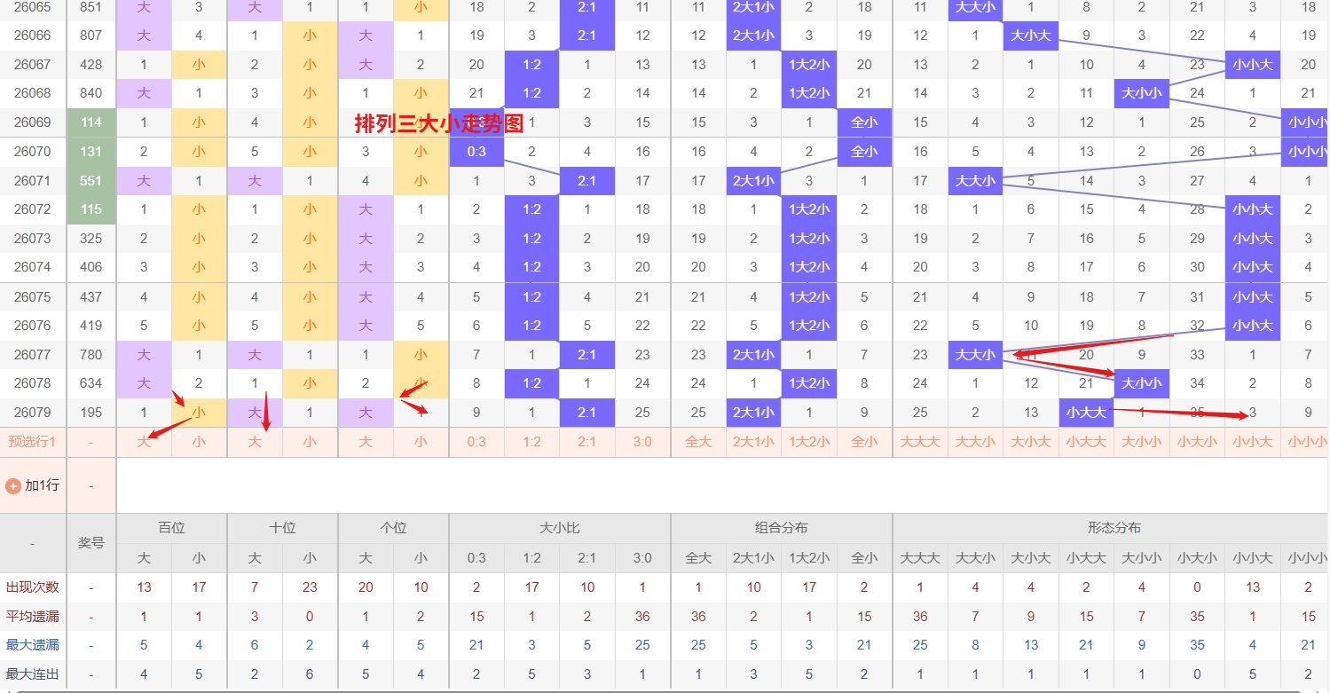 排列三 大小形态分析:从大小走势图上可以看出排列三100期内百位大小比约为45比55,十位大小比约为49:51,个位大小比约为54比46,除了个位奇数比偶数多,十位和百位偶数比奇数多。历史数据近2期开出小大大下一期的走势为,第335期开小大大后第336期开大大大。第007期开出小大大后第008期开小大小,第025期开出小大大后026期开小小小。 近期排列三大小走势中,“小大小”与“小小小”两类组合同时处于冷号区间,这在大小形态分布里并不常见,因为从概率结构来看,小号(0-4)本身基数充足,三位全小或大小交错本应维持一定出号频率,但近期却出现明显断档,说明这两种形态正处于“强遗漏”后的临界阶段,具备较强的回补需求;尤其是“小小小”这种极端小号形态,一旦和值回落至低段位(如和值6-10)形成共振,很容易在单期突袭拉回存在感,而“小大小”作为中小幅震荡的典型代表,在百位与个位小号频繁露头、十位大号间歇性发力的背景下,也具备了形态修复的基础条件,所以排列三第2026080期大小形态推荐小大大大大大