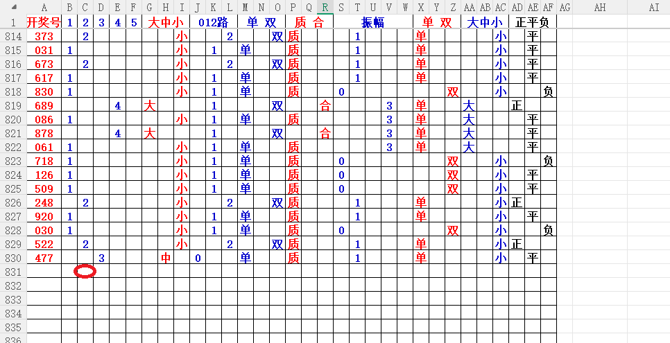 如上图8,012路分析1路出的概率大,本期可以从2路号入手,也就是23数。