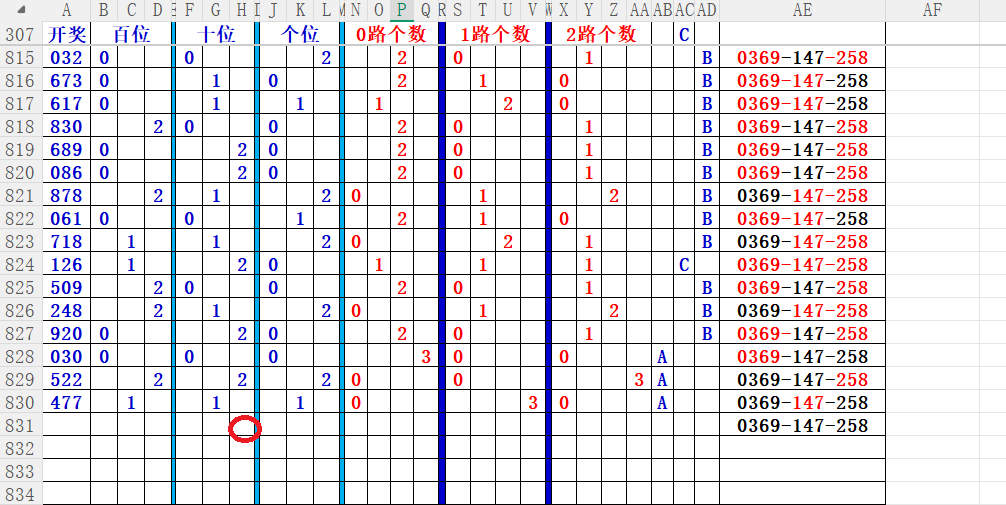 如上图56,012路分析0路出号的概率还是很大,本期可以从0路号入手做胆0369中选;看好369胆码。